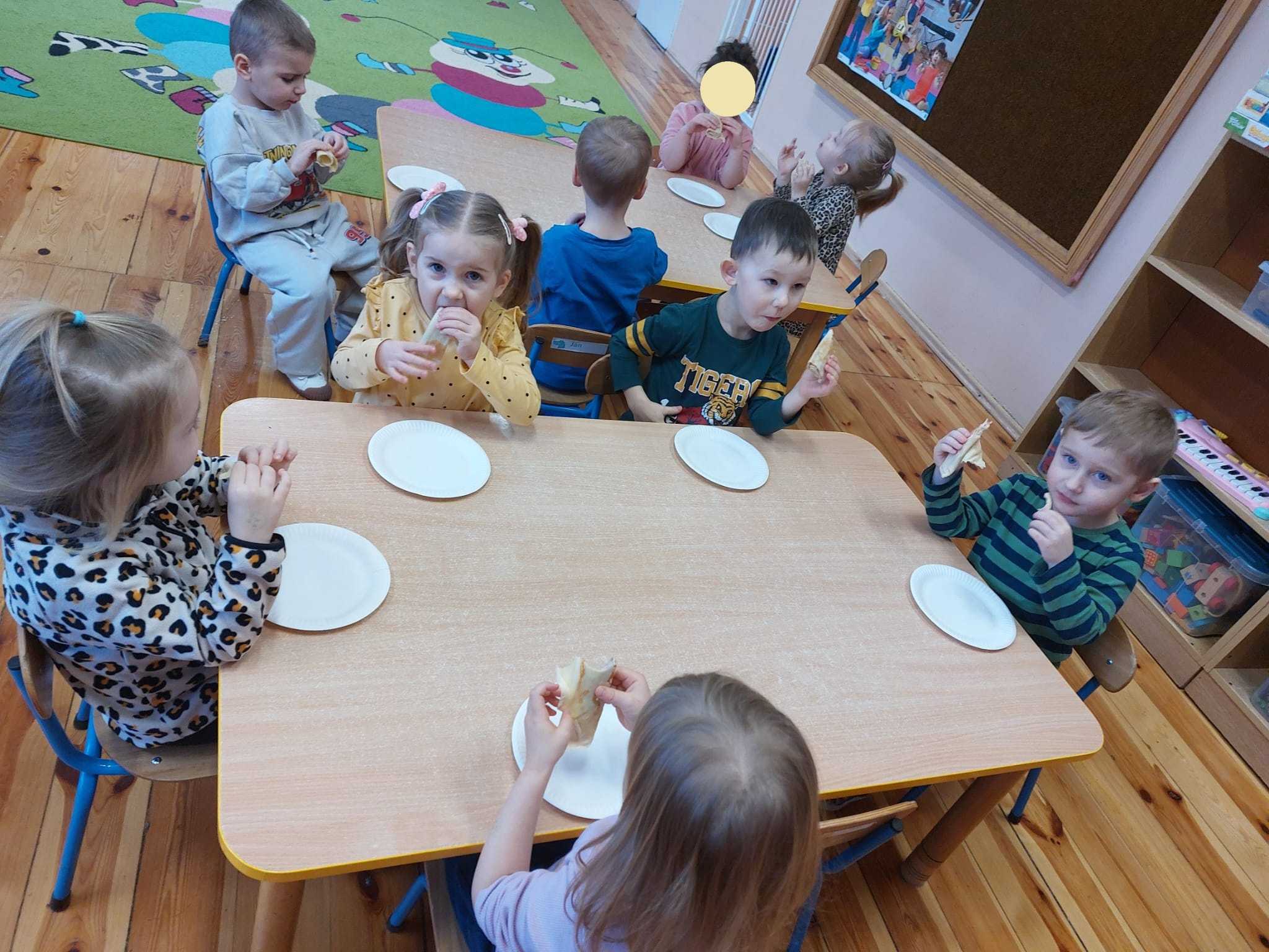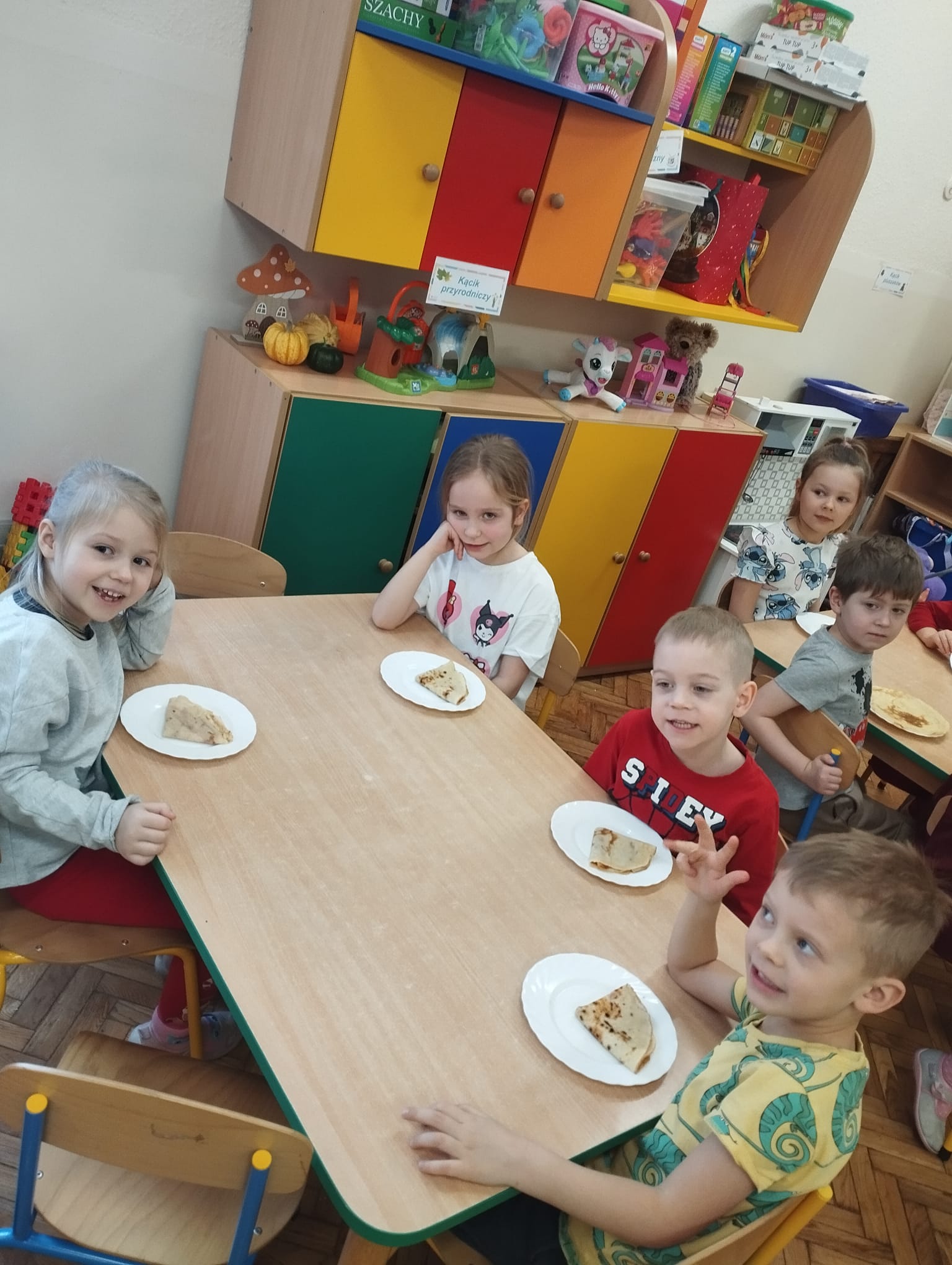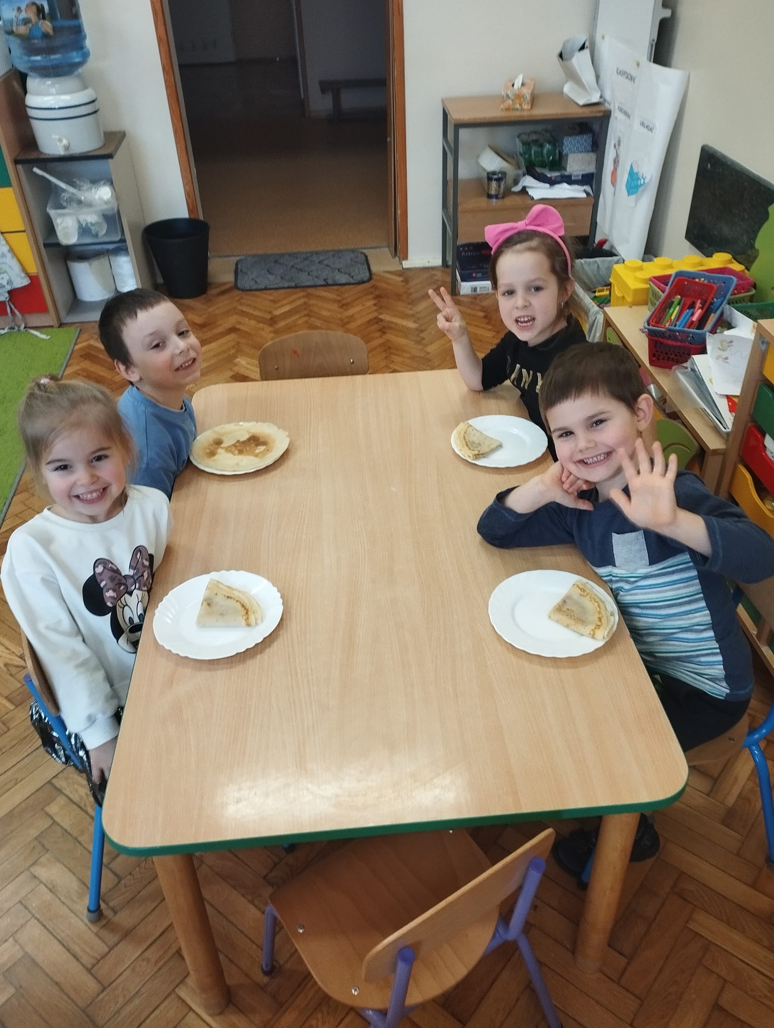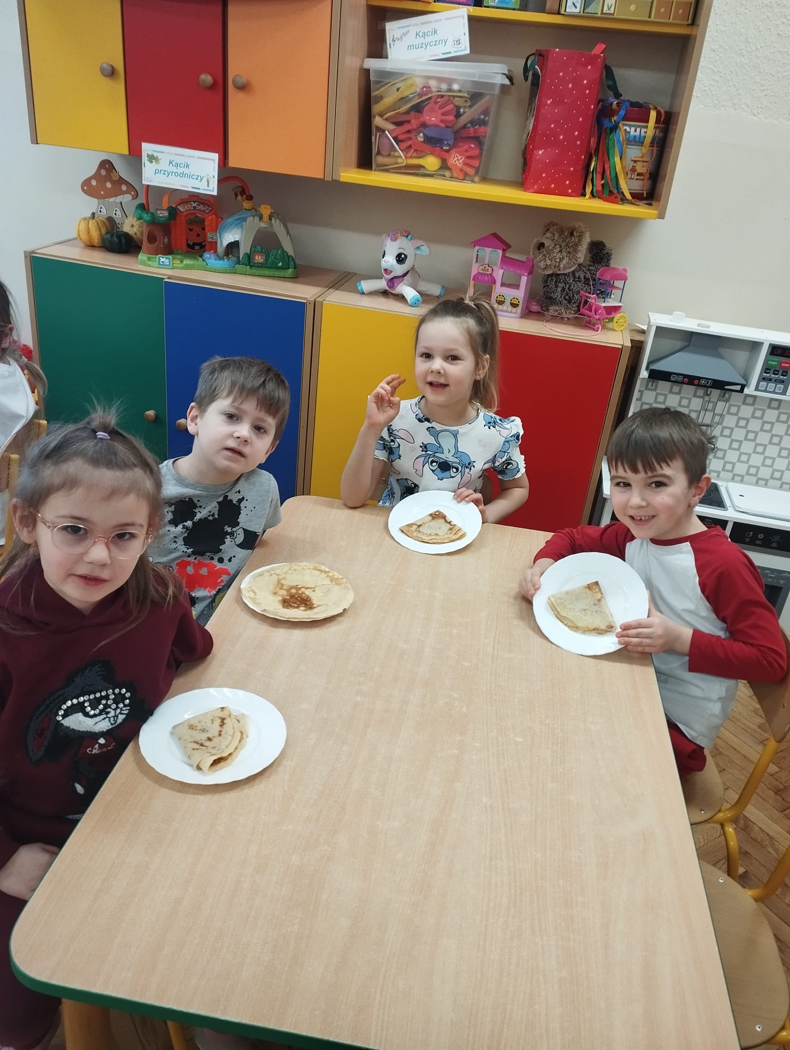 Oczywiście nie zabrakło tego, na co dzieci czekały najbardziej – prawdziwych, pachnących i pysznych naleśników, które przedszkolaki zjadły z wielkim apetytem i uśmiechem na twarzy. Zajęcia były nie tylko smaczne, ale również pełne radości i wspólnej zabawy.