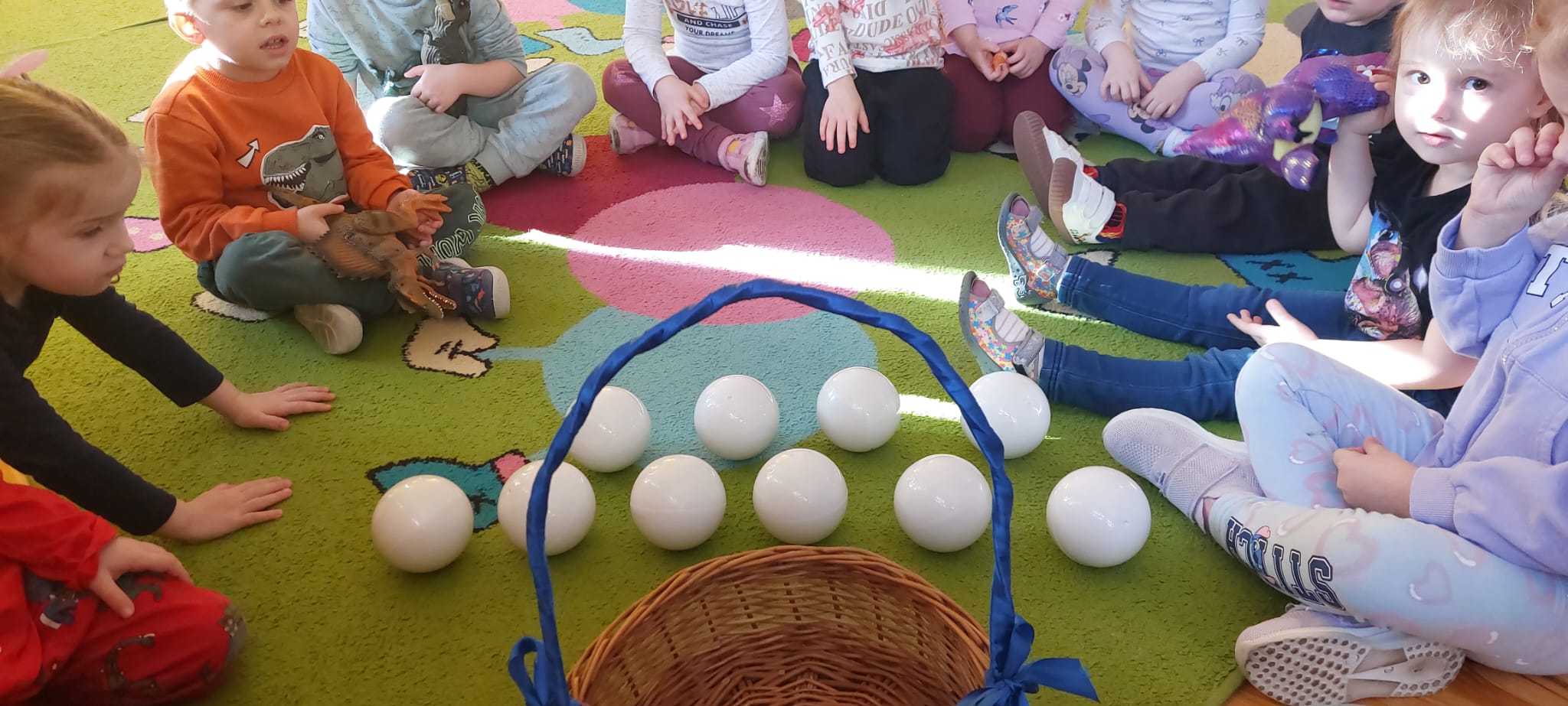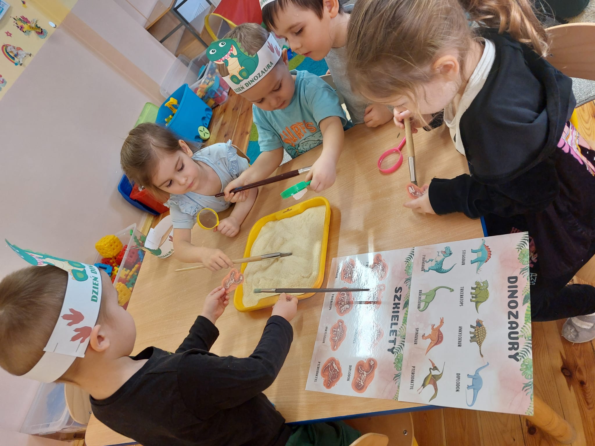 26 lutego świętowaliśmy w przedszkolu Dzień Dinozaura. Podczas zajęć dzieci dowiedziały się, jak wyginęły dinozaury, co jadły oraz gdzie żyły miliony lat temu. Poznały także nazwy wybranych gatunków i z ogromnym zainteresowaniem oglądały ich wizerunki. Rozmawialiśmy o pracy paleontologa i o tym, skąd wiemy, że dinozaury naprawdę istniały. Nie zabrakło ruchu i muzyki – odbyły się zabawy rytmiczne oraz dinozaurowe śpiewanki, które porwały wszystkie przedszkolaki do wspólnej aktywności. Dużo emocji wzbudziło również szukanie dinozaurowych jaj, ich przeliczanie oraz porównywanie liczebności zbiorów. Na zakończenie dzieci wykonały kreatywne prace plastyczne inspirowane prehistorycznym światem. Powstały kolorowe dinozaury, jaja oraz niezwykłe krajobrazy sprzed milionów lat.