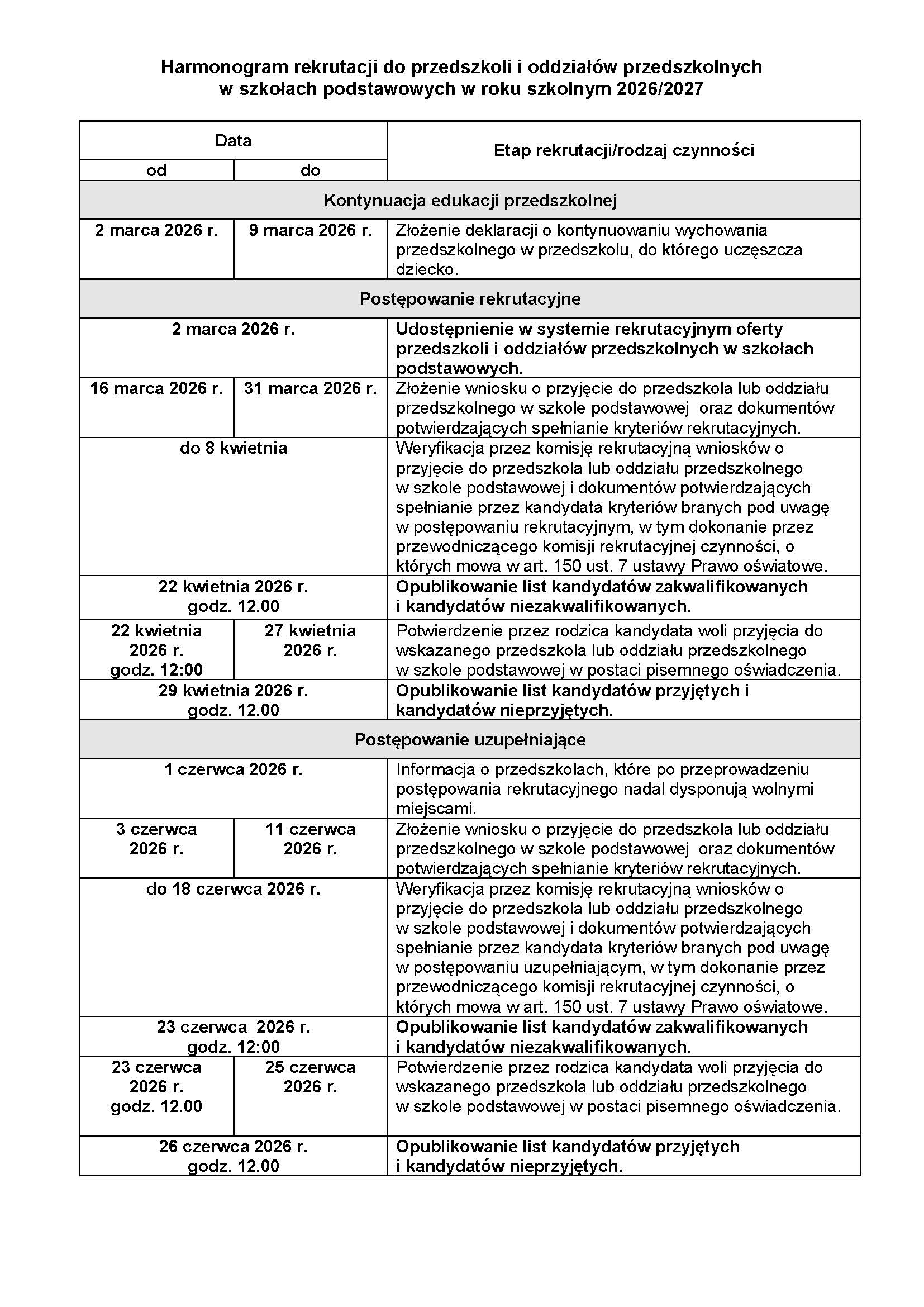 Poniżej publikujemy szczegółowy harmonogram naboru, zawierający terminy przeprowadzania postępowania rekrutacyjnego i postępowania uzupełniającego, w tym terminy składania dokumentów do publicznych przedszkoli i oddziałów przedszkolnych w szkołach podstawowych. Terminy te zostały określone w zarządzeniu nr 76.2026 Prezydenta Miasta Zielona Góra z dnia 27 stycznia 2026 r.