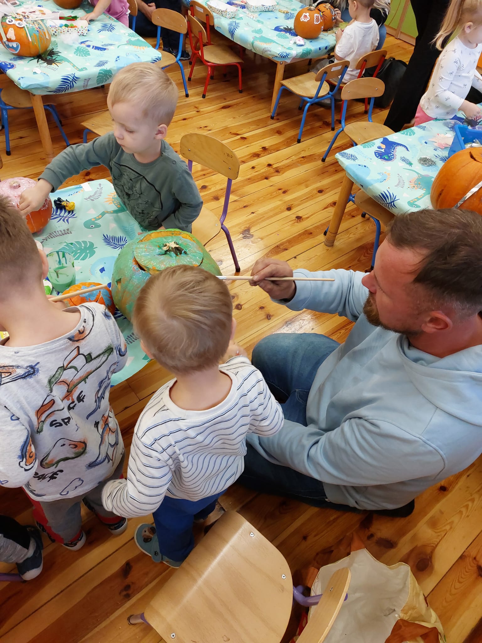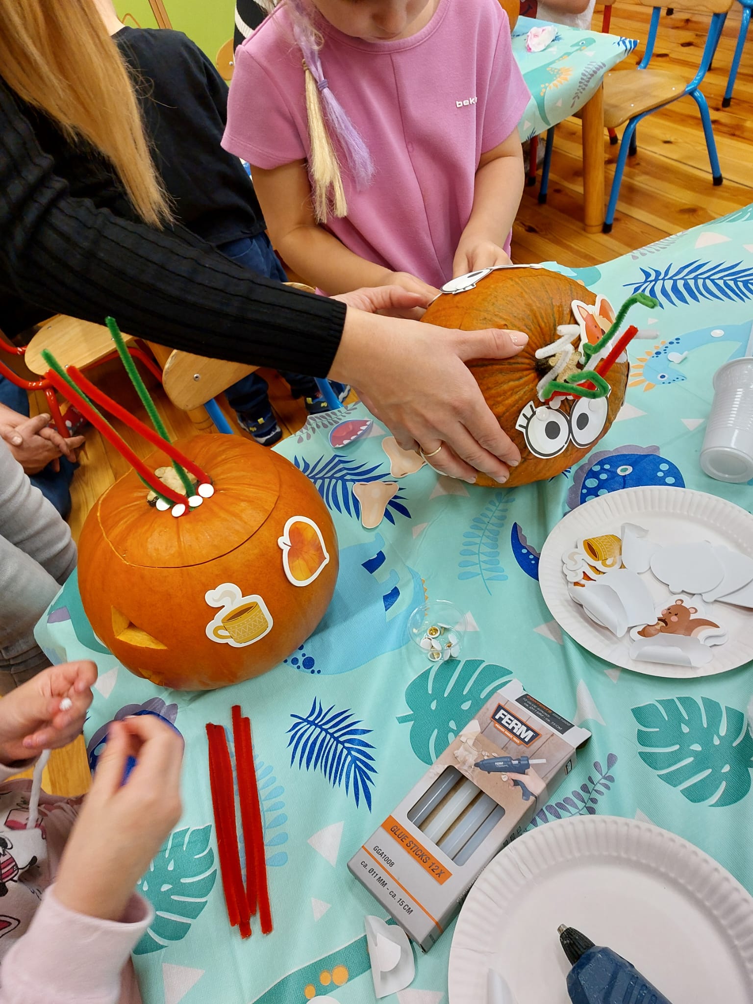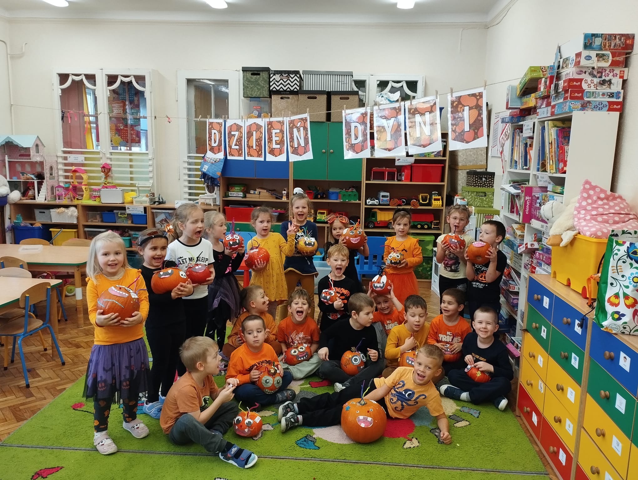 W piątek w naszym przedszkolu królowała dynia! Z okazji Dnia Dyni we wszystkich grupach odbyły się fascynujące zajęcia tematyczne. Dzieci odkrywały tajniki budowy dyni oraz poznawały jej drogę od malutkiego nasionka aż po dojrzały, soczysty owoc. Przedszkolaki z ogromnym zaangażowaniem dekorowały przyniesione dynie, tworząc kolorowe galerie, które teraz zdobią korytarze naszego przedszkola. Nie zabrakło także zabaw tanecznych i muzycznych, a nawet dyniowego kodowania na dywanie – to było prawdziwe połączenie nauki i zabawy! Na deser – a właściwie na obiad – dzieci miały okazję spróbować pysznej, aromatycznej zupy dyniowej przygotowanej specjalnie przez naszą szefową kuchni. To był dzień pełen radości, kreatywności i dyniowej magii!